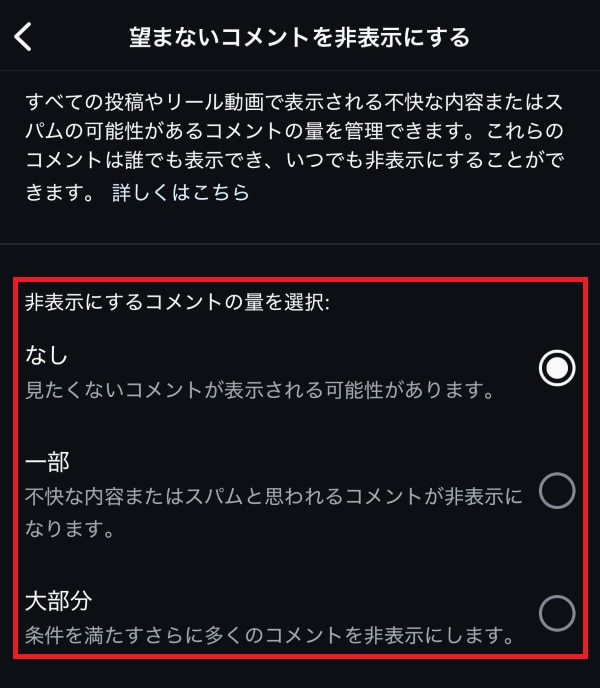 非表示にするコメントの量は、「なし」、「一部」、「大部分」の3つから選択が可能です。