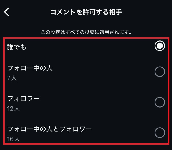 ・コメントを許可する相手を設定:自分の投稿へコメント可能な人の範囲を設定できる機能