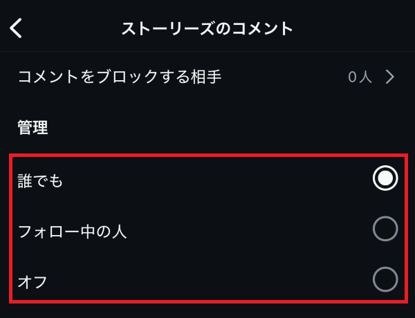 「ストーリーズ」のコメントの設定では、「コメントをブロックする相手」や、コメントを許可する相手の範囲を「誰でも」、「フォロー中の人」、「オフ」から設定できます。