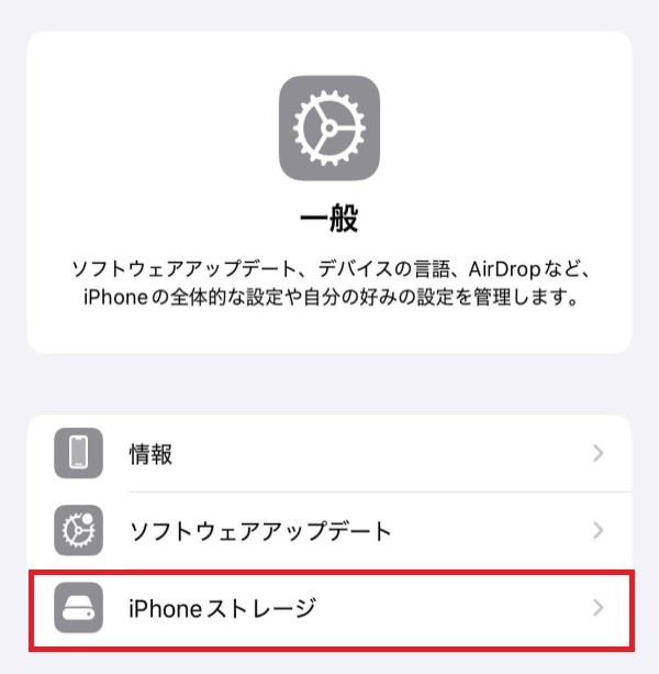 1.「設定」アプリ>「一般」>「iPhoneストレージ」をタップする