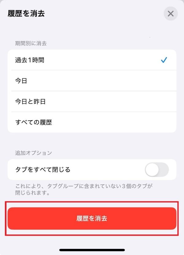 3. 消去する期間を選択してから「履歴を消去」をタップする