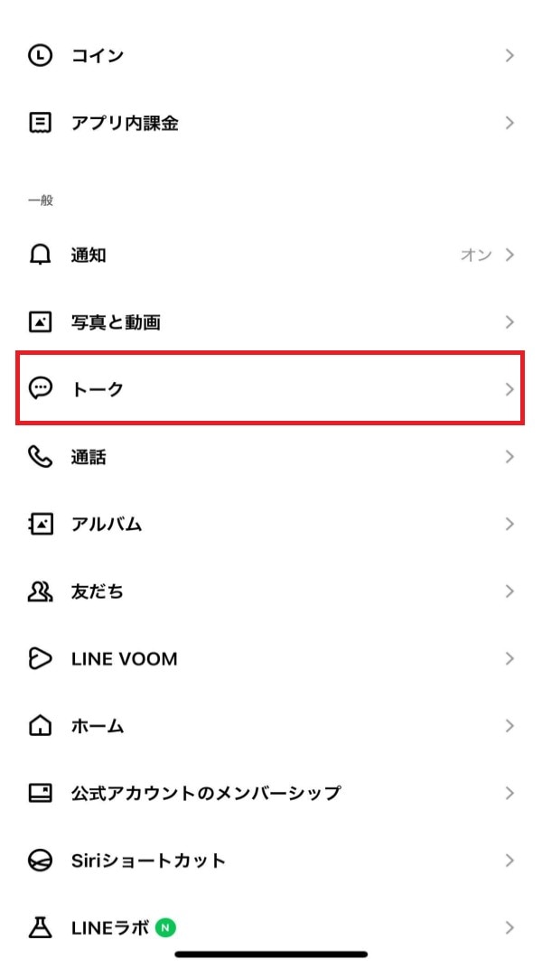 1.「LINE」アプリのホームから「設定(歯車のアイコン)」>「トーク」の順にタップする