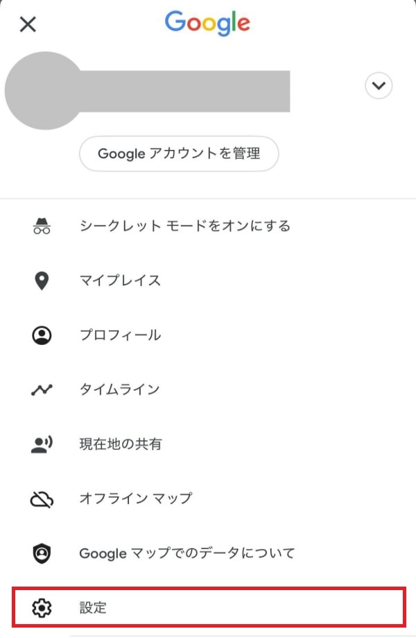1.「Google マップ」アプリを開き、プロフィール写真またはイニシャルから「設定」に進む