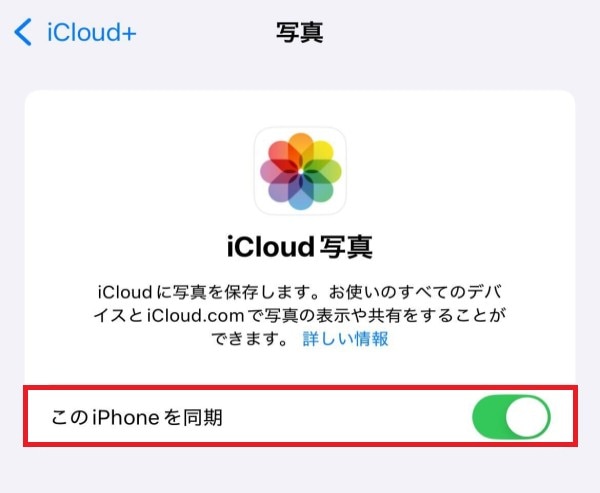 2.「このiPhoneを同期」の横のボタンをタップしてオンにする(iOS 15以前の製品では、「iCloud写真」の横のボタンをタップしてオンに切り替える)