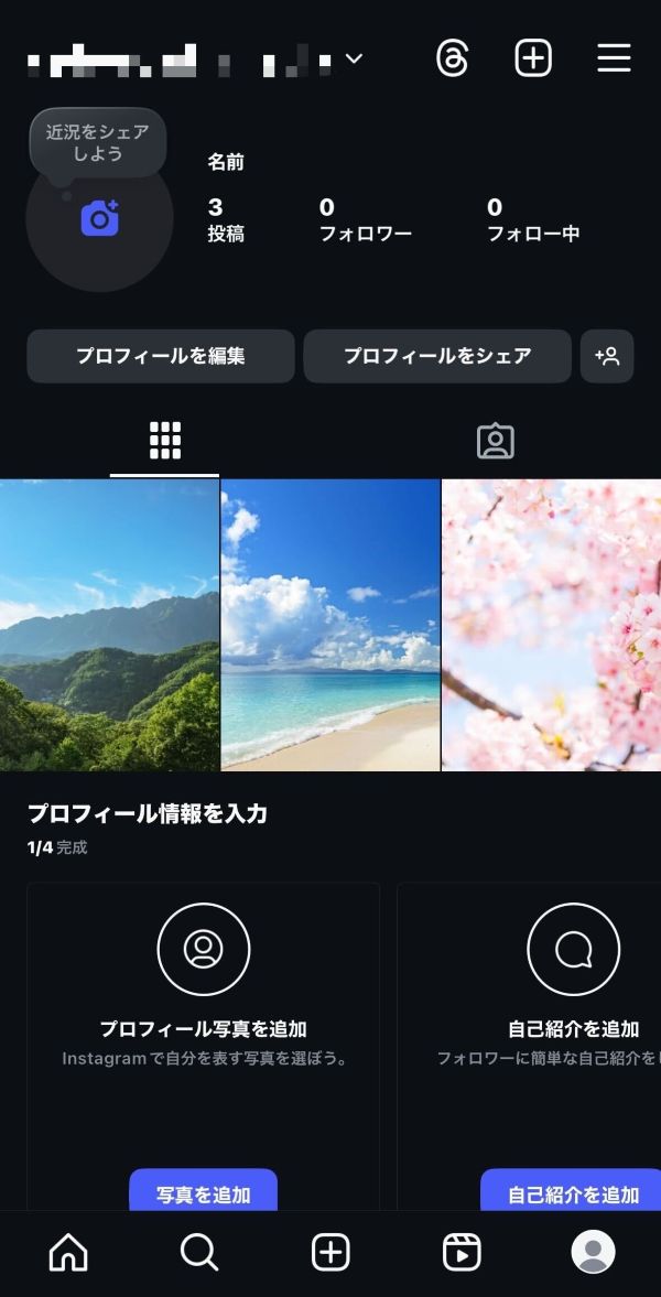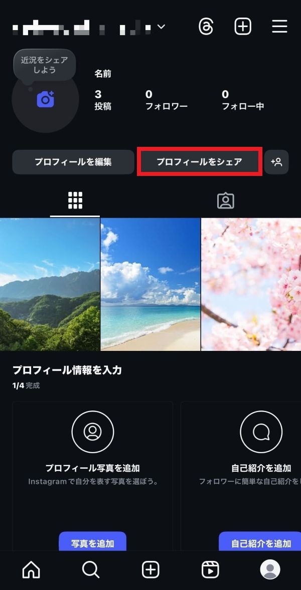 1.インスタのプロフィール画面を開き、「プロフィールをシェア」をタップする