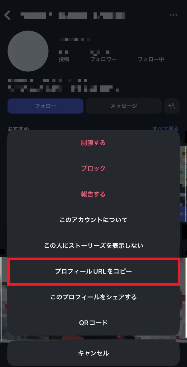 他者のアカウントURL(プロフィール画面のURL)は、以下の手順で取得して貼り付けることができます。