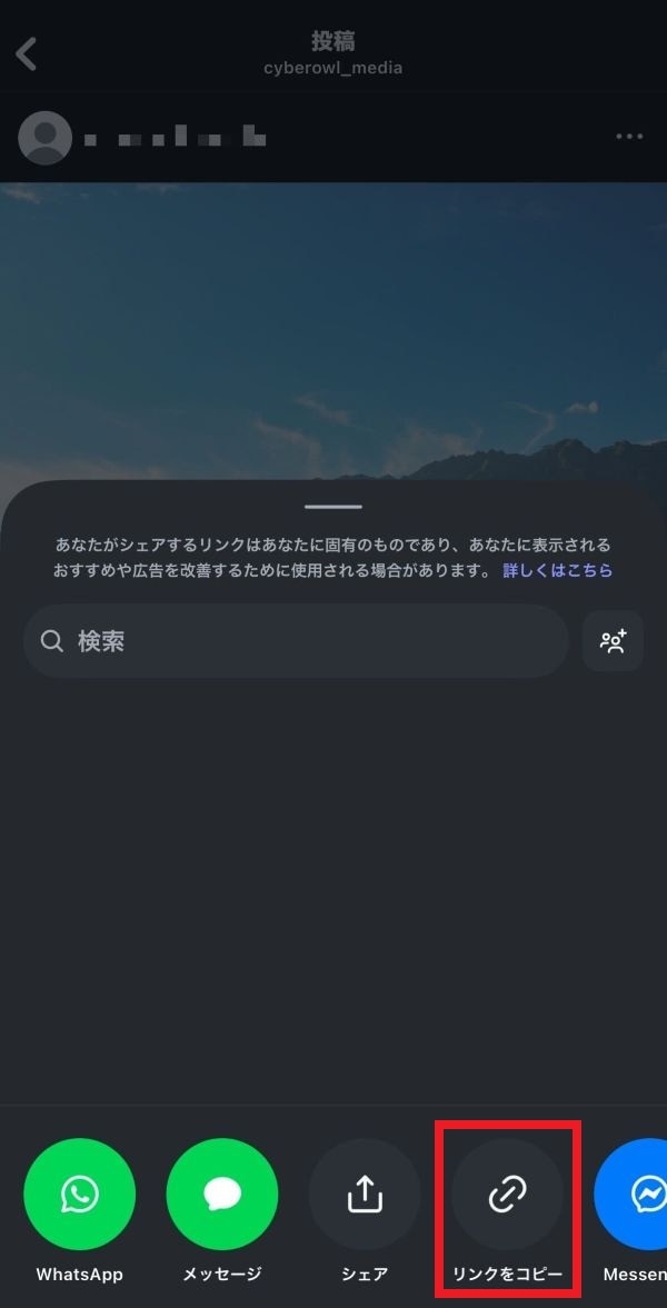 2.「リンクをコピー」をタップすると投稿URLがコピーされるので、ほかのSNSなどに貼り付ける