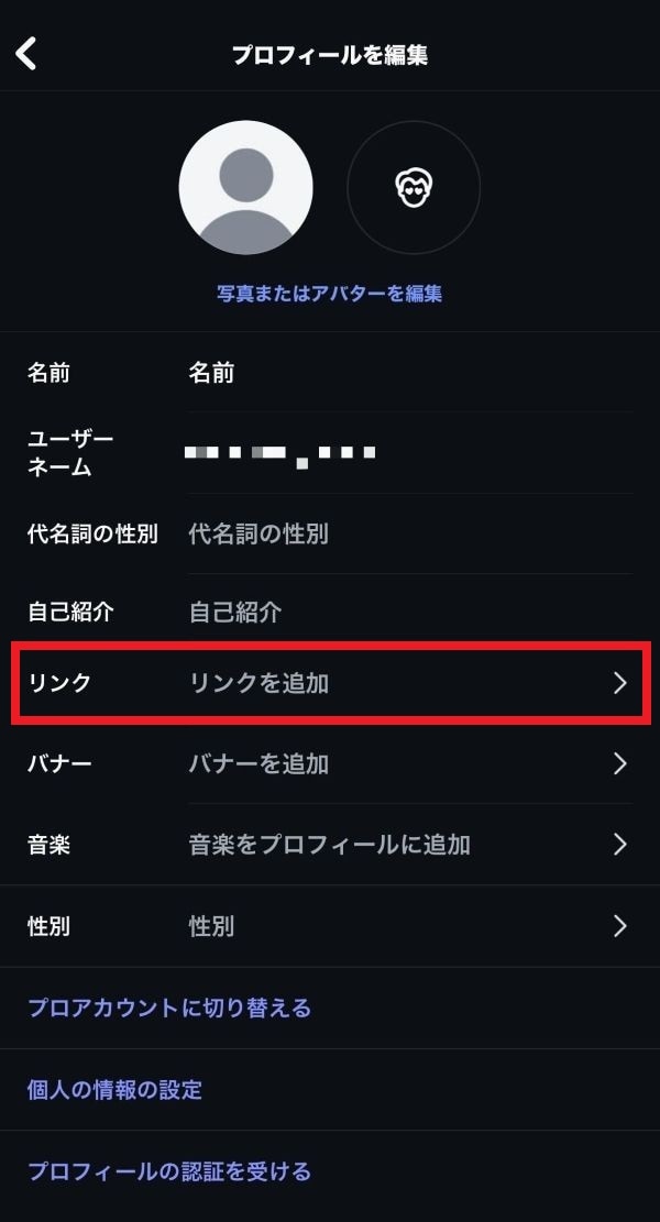 プロフィール画面にURLを設置したい場合は、プロフィール画面で「プロフィールを編集」>「リンクを追加」の順にタップします。