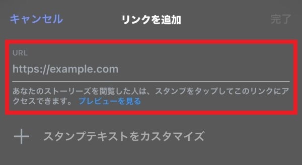 ストーリーズにURLを設置したい場合は、編集画面上部にあるステッカーボタンをタップし、「リンク」を選択します。「リンクを追加」という画面が表示されるので、URLを入力しましょう。