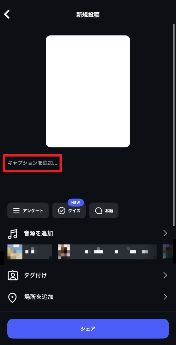 2.新規投稿画面で、「キャプションを追加」をタップする